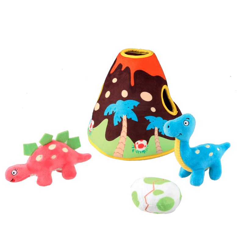 Incluye un Volcán de peluche, un Dinosaurio estegosaurio de felpa, un Dinosaurio tanystropheus de peluche y un huevo de dinosaurio de peluche.