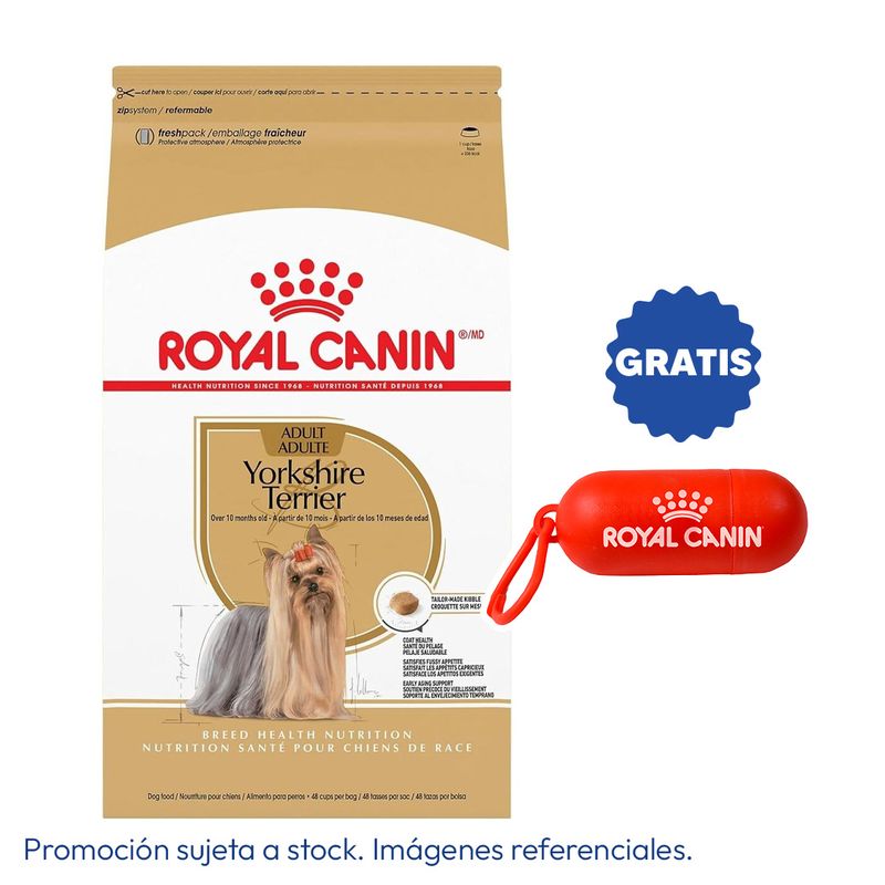 • El pelaje de un Yorkshire Terrier es único, ya que crece en hebras individuales continuas, razón por la cual Royal Canin proporciona biotina y ácidos grasos omega-3 y -6 para ayudar a mantener a su Yorkshire Terrier maravillosamente suave y lujoso.
